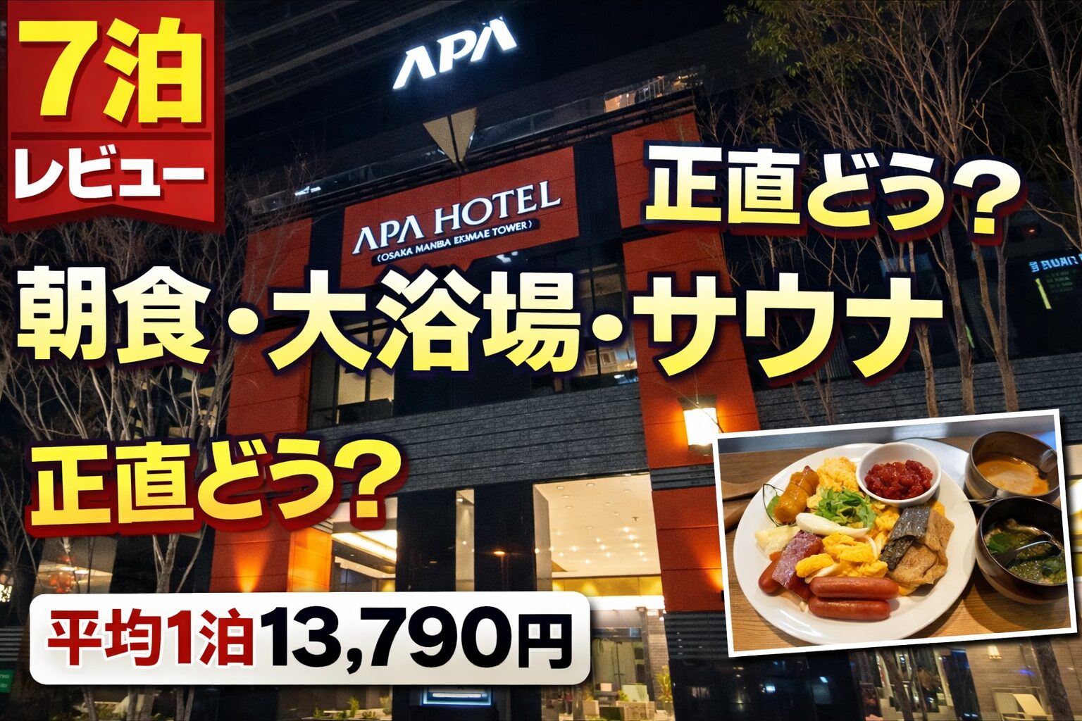今回は アパホテル&リゾート〈大阪なんば駅前タワー〉 にダブル1名利用・朝食付きで7泊しました。実体験ベースで、良かった点・気になった点も含めて正直にまとめます。